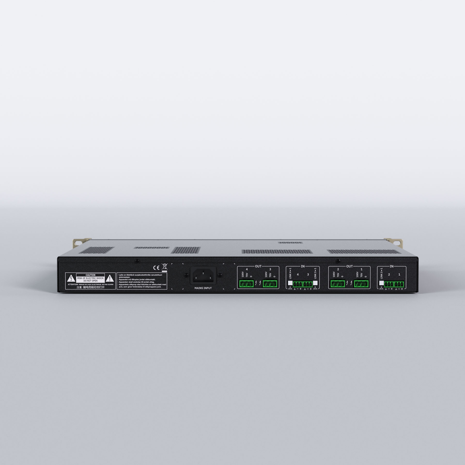 - 4 intrări audio analogice și 4 ieșiri audio alimentate de 150 WRMS @ 70/100V