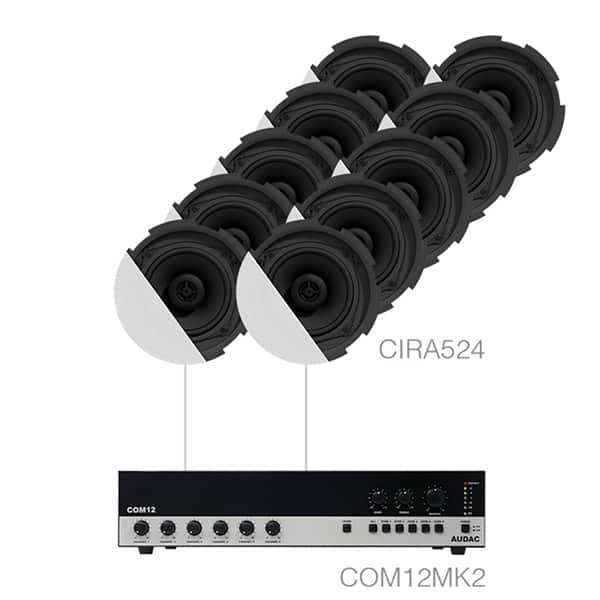 Audac Canto7.10P W este un set ce contine boxele full range CIRA530 cu design grila fara margini. CIRA530 ofera un sunet clar si inteligibil, potrivit pentru sistemele de 100 V pentru anunturi si muzica de fundal. Amplificat de COM12MK2, acesta ofera o flexibilitate extraordinara pentru conectarea surselor si a microfoanelor. Acest sistem cu 10 boxe CIRA530 poate acoperi suprafete de 200 m2. Aceasta solutie de 100V necesita setarea puterii de 12W.