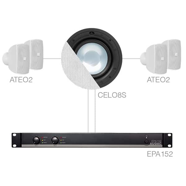 Audac Sona82.4S W este un sistem audio de interior format din 4 boxe ultra-compacte ATEO2 cu driver de 2 inch si sunet foarte plin, subwoofer CELO8S de 8 inch ce reproduce frecventele joase in cel mai natural mod, cu crossover stereo incorporat si amplificator stereo EPA152 cu eficienta energetica clasa D. Acest sistem poate acoperi pana la 100 m2 cu muzica ambientala puternica si clara.