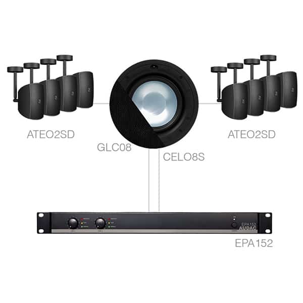- Audac Sona82.8SC B este un sistem audio de interior format din 8 boxe ultra-compacte ATEO2SD, subwoofer CELO8S si amplificator stereo EPA152