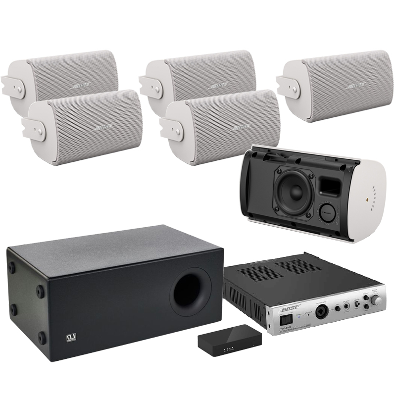 Set pentru sonorizare in sistem 100V, discret, de la brandul Bose pentru restaurante hoteluri, sali de fitness si cafenele. Pentru suprafete de pana la 140mp, impartit in 2 zone cu volum reglabil.