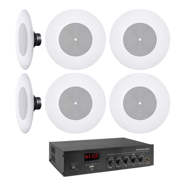 Sistem 6 boxe tavan Jbl CSS8008 Commercial echipate cu amplificator 45W/100V si interfata bluetooth. Sistemul ofera un sunet ambiental placut si frecvente joase proeminante. Poate fi controlat prin bluetooth sau poate fi conectat orice dispozitiv la intrarea AUX. Ideal pentru sonorizare magazine, cafenele sau birouri.