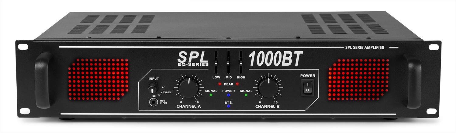 Un amplificator SPL de 2x 500W cu receptor BT pentru streaming audio la amplificator. Acest amplificator „seria EQ” cu egalizator încorporat pe 3 benzi folosește cea mai modernă tehnologie de amplificare, rezultând un sunet clar și puternic, un dispozitiv care nu ar trebui să lipsească în nicio instalație DJ. Amplificatorul are mai multe intrări RCA stereo pentru televizor, CD, PC etc. Există o mufă frontală de 3,5 mm pentru conectarea unui player MP3. Cu panou frontal modern iluminat cu LED roșu.