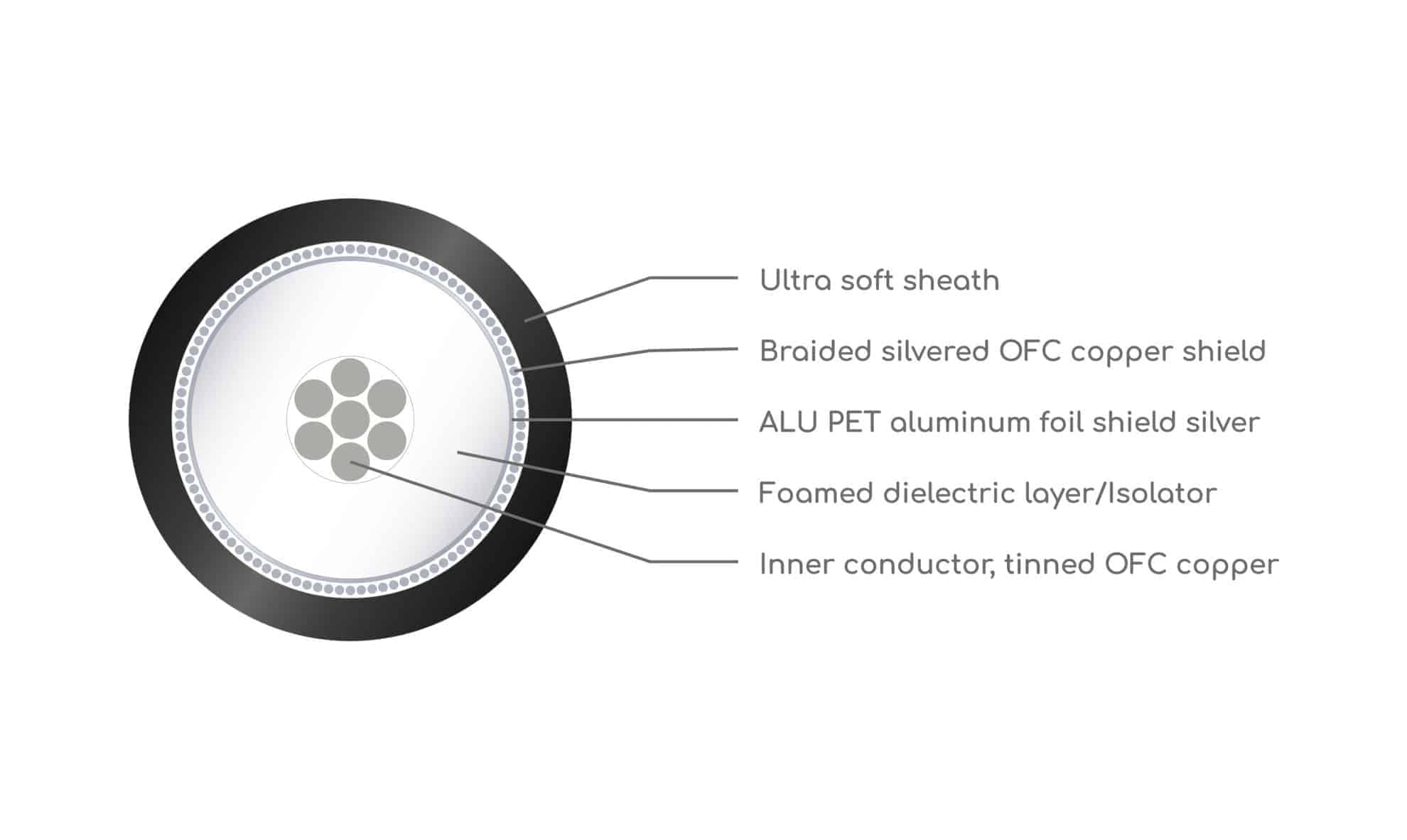 Cablu coaxial din Cupru OFC (99,999%) liţat, placat cu Staniu, ecranat (Aluminiu placat cu Argint şi pet), cu izolatie pvc negru, 1 cablu de 7×0,4mm2 conductori, cu izolaţie de polietilenă.