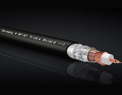 Cablu din Cupru OFC (99,999%) liţat triplu ecranat, cu cămaşă pvc negru. 1 cablu răsucit de 19xØ0,185mm, cu izolaţie de polietilenă.