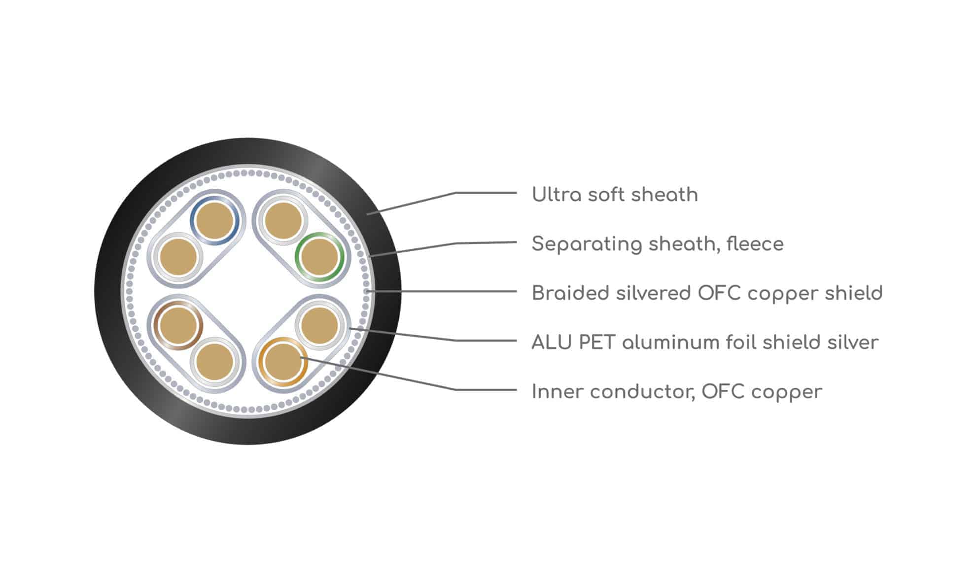 Cablu din Cupru OFC (99,999%) solid pentru reţea (instalaţii fixe), ecranat (ecran complex din Cupru OFC placat Argint şi 4 foi de Aluminiu + pet pentru reducerea interferenţelor DECT, cauzate de telefoane mobile, microunde şi surse de alimentare), cu Jitter 0 indiferent de frecvenţă. Izolatie pvc negru, 8 cabluri dispuse perechi răsucite, fiecare pereche cu izolaţie de Aluminiu + pet. Cat7A, 1000MHz real!