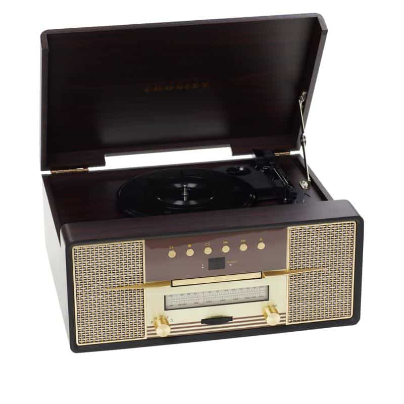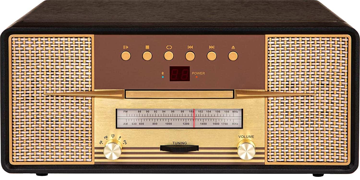 Acest sistem de divertisment este echipat cu un platan cu 3 trepte de viteză (33 1/3, 45 și 78 RPM), CD player, radio AM/FM și un receptor Bluetooth încorporat, astfel încât să puteți reveni și să vă ascultați muzica preferată oricum doriți. Carcasa din lemn adaugă o atingere elegantă și are un capac asortat cu balamale metalice pentru a ajuta la menținerea prafului în timp ce nu este utilizat