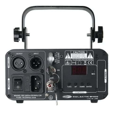 Showtec Galactic B400 – Laser albastru pentru Disco si scena. B400 este succesorul laserului de culoare albastră unică din seria Galactic Value Line. Are cu 100 mW mai multă putere laser decât primul model B și este actualizat cu o telecomandă IR. La fel ca și G40, are 8 canale DMX și un total de 32 de modele diferite.