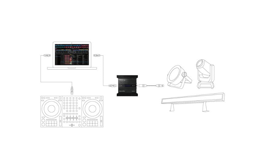 Pioneer RB-DMX1 poate efectua modele de iluminare intuitive, proiectate in Rekordbox DJ pe toate corpurile de iluminat compatibile DMX512, utilizand interfata dedicata.