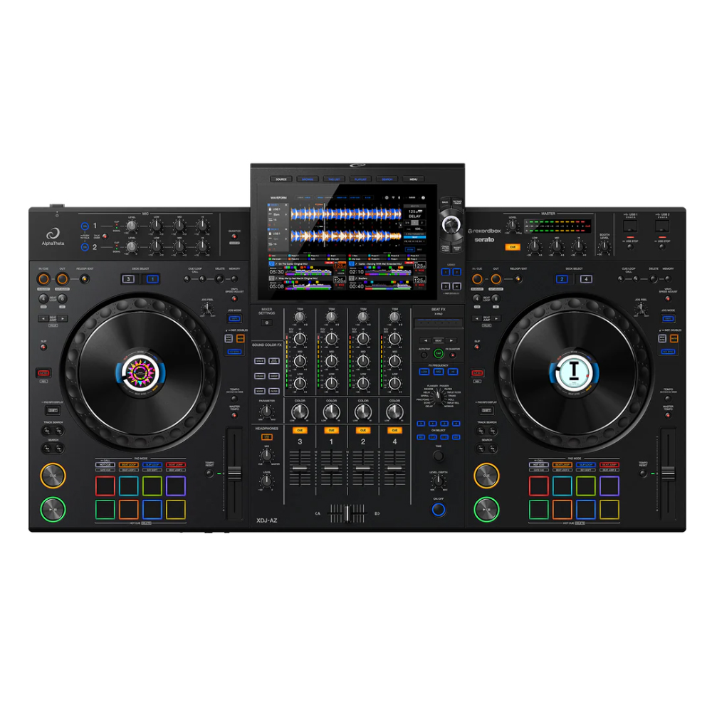 AlphaTheta XDJ-AZ – Consolă DJ all-in-one cu 4 canale, jog-uri de dimensiuni standard, funcții avansate și cu un design moștenit de la modele consacrate precum player-ul CDJ-3000 și mixerul DJM-A9. Poate fi folosită alături de recordbox-uri cu compatibilitate Mac/PC/Android/iOS sau alături de licențele Serato DJ.