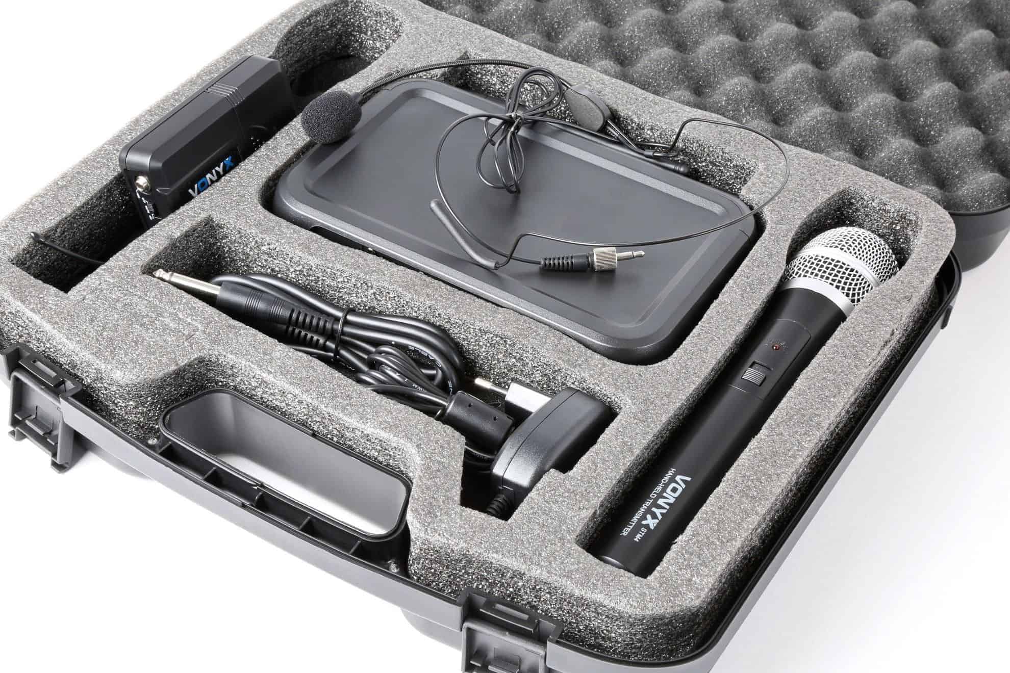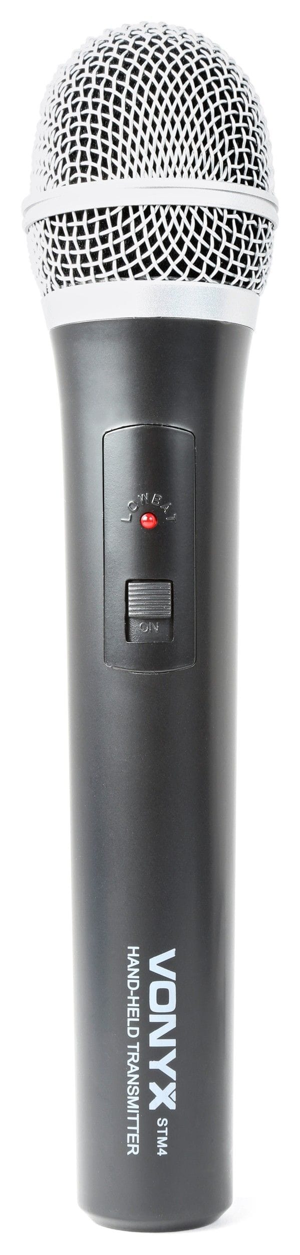 Sistem de microfoane wireless UHF, inclusiv microfon de mana și emițator bodypack cu microfon headset. Ideal pentru sistemele care necesita libertatea a doua microfoane wireless independente la un preț economic. O distanta de 60 m sau mai mult poate fi obținuta în condiții ideale.