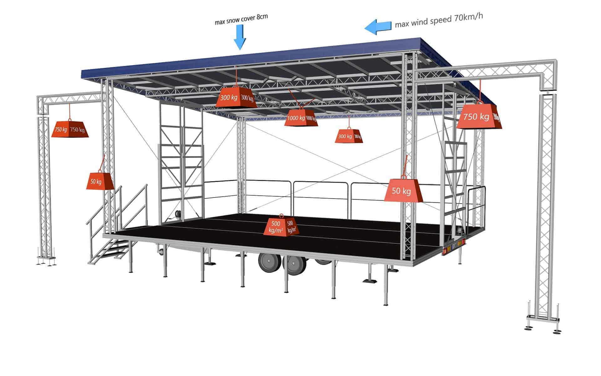 Solutiile de design utilizate permit pregatirea simpla si rapida a scenelor pentru utilizare. Sistemul de ridicare a acoperisului este alcatuit dintr-un sistem de nivelare autoportanta, semi-automata a aripilor de acoperis si partea centrala asociata, ridicata manual sau automat, in functie de preferintele cumparatorului. Scena rezista la sarcini de pana la 500 kg – m2, iar pe acoperis exista posibilitatea de a atasa accesorii de pana la 1000 kg la mijloc si pana la 300 kg pe fiecare dintre partile alunecoase ale acoperisului. Avantajul suplimentar al scenei mobile este posibilitatea extinderii sale cu aripi de sunet, care permit instalarea intregului sistem de sunet in afara scenei. Solutiile de constructie si tehnologia aplicate fac din scena mobila o economie de cumparare si o utilizare extrem de eficienta. Doua persoane vor putea sa se ocupe fara efort sa pregateasca o scena gata de utilizare in 30-60 de minute.