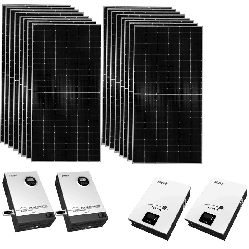 Sistem fotovoltaic 10KW, complet, off grid, cu 20 panori 550W monocristaline, 2 invertoare hibrid si 2 baterii de ultima generatie LiFePO4. Un Kit complet de panouri fotovoltaice 10 kw cu acumulatori la un pret imbatabil.