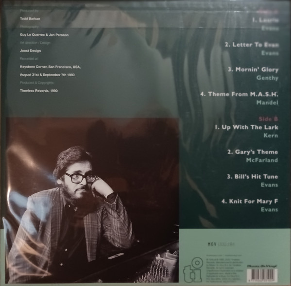 A1 Laurie Written-By – B. Evans*Written-By – B. Evans*7:51 A2 Letter To Evan Written-By – B. Evans*Written-By – B. Evans*8:40 A3 Mornin’ Glory Written-By – B. Genthy*Written-By – B. Genthy*3:54 A4 Theme From M.A.S.H. Written-By – J. Mandel*Written-By – J. Mandel*4:20 B1 Up With The Lark Written-By – J. Kern*Written-By – J. Kern*6:59 B2 Gary’s Theme Written-By – G. McFarland*Written-By – G. McFarland*5:41 B3 Bill’s Hit Tune Written-By – B. Evans*Written-By – B. Evans*7:08 B4 Knit For Mary F Written-By – B. Evans*Written-By – B. Evans*6:37