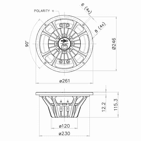 Difuzor subwoofer profesional 10 inch – 261 mm., putere 300w/RMS, impedanta 8 Ohm, sensibilitate 98 dB, raspuns in freventa 60-5.000 Hz, diametru bobina 2.5 inch- 65mm, greutate difuzor 2.3 Kg, magnet Neodymium Slug, diametrul 230 mm, greutate 2.8 kg