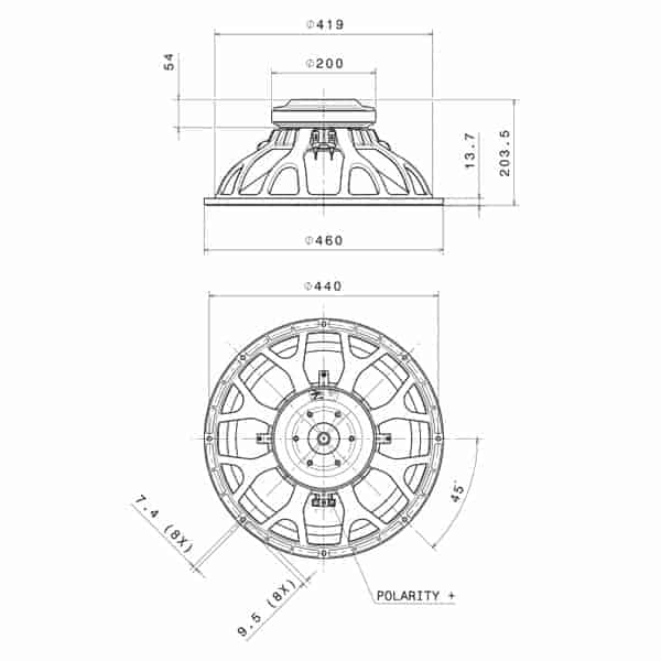 Difuzor subwoofer profesional 18 inch – 460 mm., putere 1000w/RMS, impedanta 8 Ohm, sensibilitate 98 dB, raspuns in freventa 35-2000 Hz, diametru bobina 4 inch- 100mm, greutate difuzor 10,10 Kg, diametrul 419 mm, greutate 11.5 kg
