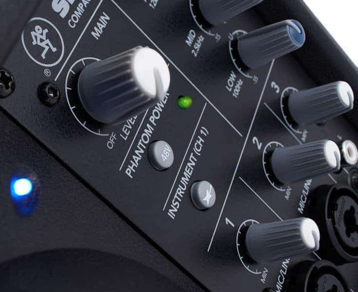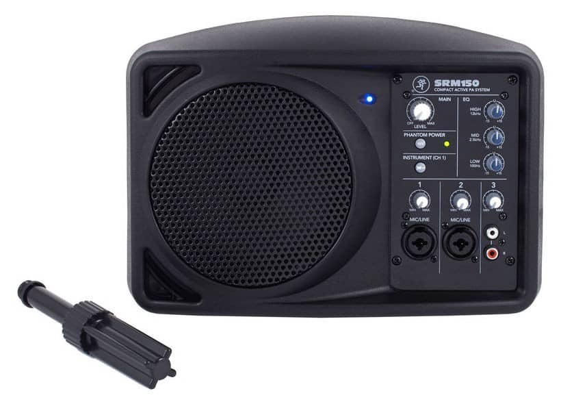 Mackie SRM 150 – monitor activ compact, auto-amplificat, putere 150W, EQ pe 3 benzi, difuzor 5.25 inch, raspuns frecventa 100Hz-17.5KHz, SPL maxim 120 dB, 2 intrari microfon/linie cu alimentare phantom 48V, intrari RCA, intrare de instrument, XLR thru cu comutator linie-microfon pentru trimiterea in alt SRM 150 sau direct in PA, posibilitate de montare pe stativul de microfon.