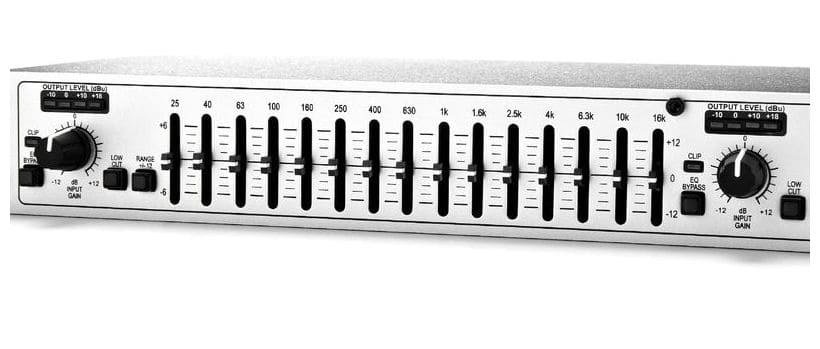 DBX 215S egalizator grafic cu 2 x 15 benzi. Boost si cut intre + – 6 – 12 dB, comutator pentru bypass, intrare cu gain de + – 12 dB , indicator cu 4 LED-uri pentru monitorizarea nivelelor la iesiri