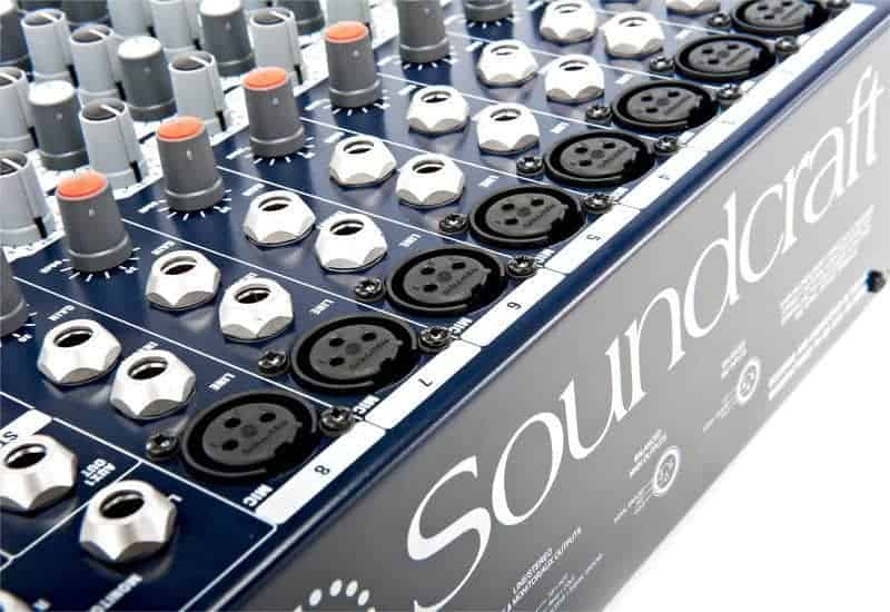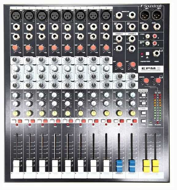 SOUNDCRAFT EPM8 mixer audio. Canale: 8 mono + 2 stereo. Preamplificatoare GB30 si phantom power de 48V, EQ cu 3 benzi pentru canalele mono si EQ cu 2 benzi pentru cele stereo, 2 trimiteri auxiliare + 1 intoarcere. Conectori: XLR, jack 6.3 mm, RCA. Dimensiuni (I x L x A): 90.5 x 330 x 362 mm. Greutate: 5.6 kg.