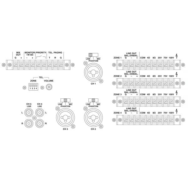 Amplificator modular 4 iesiri si 5 intrari. putere 4 x 120W-RMS 4-8Ohm sau 25-70-100V