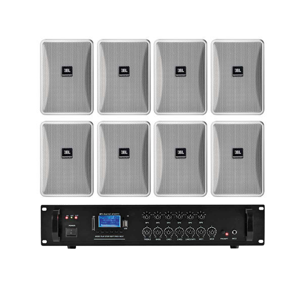 Sistem audio pentru terasa, gradini, piscine, restaurante sau hoteluri, format din 8 boxe exterior albe JBL si amplificator 240W cu Tuner FM si Player USB / Bluetooth. De asemenea amplificatorul este dotat cu 2 intrari de microfon pentru anunturi sau conferinte. Ofera o sonorizare calitativa si uniforma, cu design foarte elegant si minimalist.