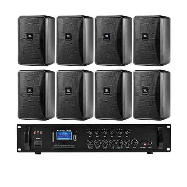 Sistem audio pentru terasa, gradini, piscine, restaurante sau hoteluri, format din 8 boxe negre JBL si amplificator 240W cu Tuner FM si Player USB / Bluetooth. De asemenea amplificatorul este dotat cu 2 intrari de microfon pentru anunturi sau conferinte. Ofera o sonorizare calitativa si uniforma, cu design foarte elegant si minimalist.