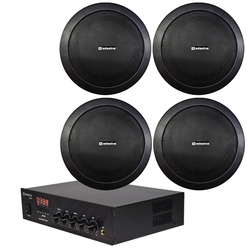 Sistem audio complet pentru sonorizare cu 4 Boxe plafon negre Adastra cu amplificator MP3-FM-BT – pentru spatii comerciale, hoteluri, cafenele, restaurant sau birouri.