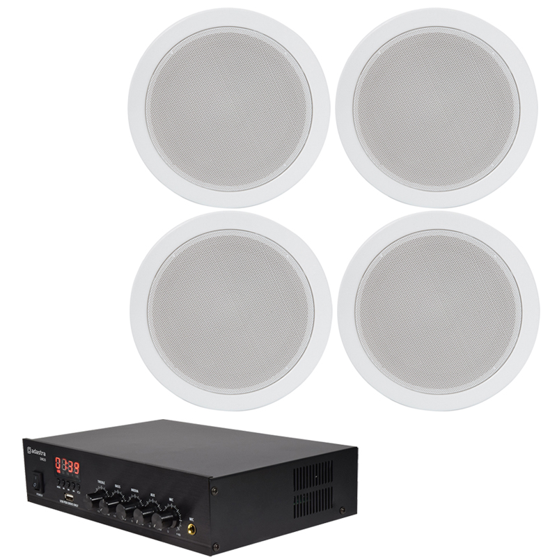 Sistem audio complet pentru sonorizare horeca cu 4 Boxe tavan albe Adastra cu amplificator MP3-FM-BT – pentru spatii comerciale, hoteluri, cafenele, restaurant sau birouri.