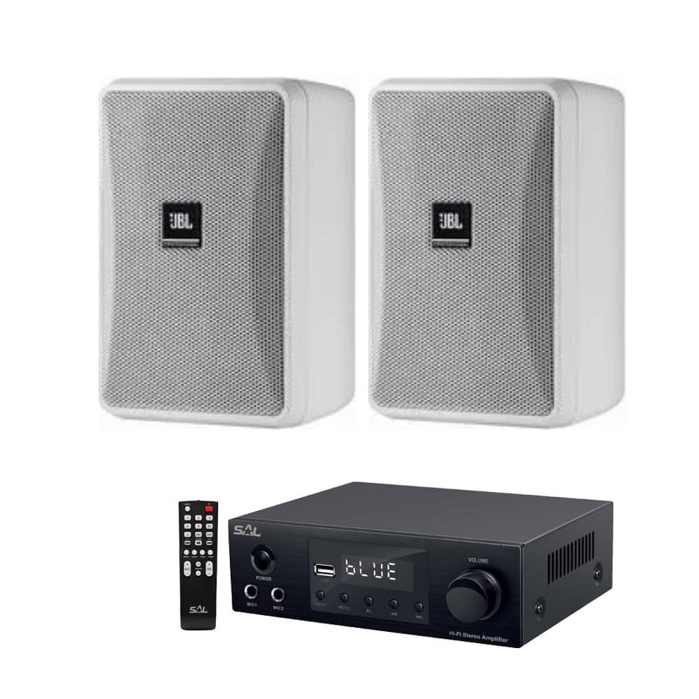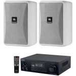 Sistem de sunet pentru exterior, echipat cu boxe JBL de culoare alba si mini-amplificator cu putere de 2x25W si conectivitate bluetooth.