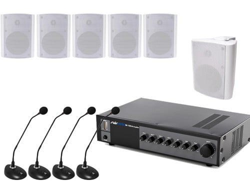 Sistem audio compact pentru conferinte, discursuri sau prezentari, optimizat pentru a reproduce cu acuratete vocea si pentru a evita microfonia. Configurat pentru 4 vorbitori simultan, cu prioritate pentru presedinte, acest echipament poate echipa sali de conferinte de pana la 150mp.