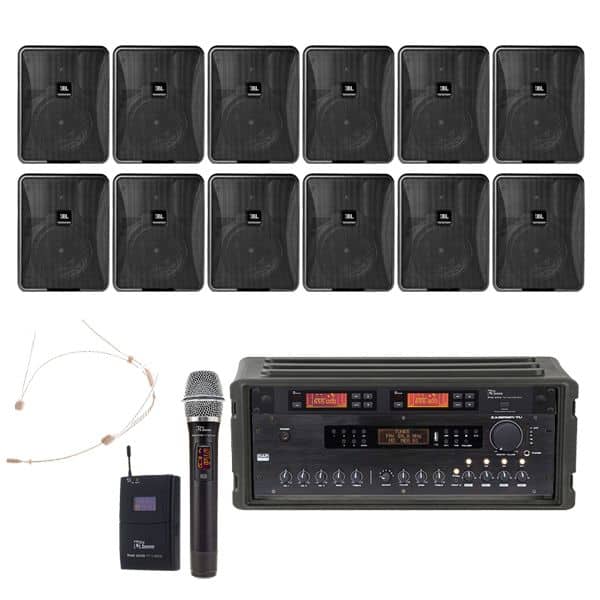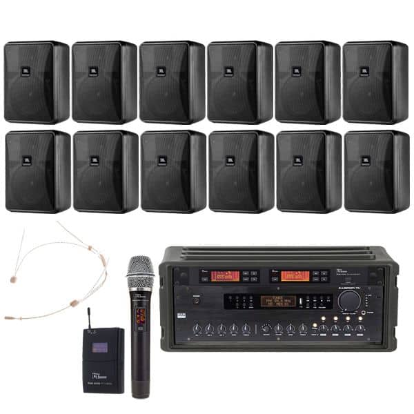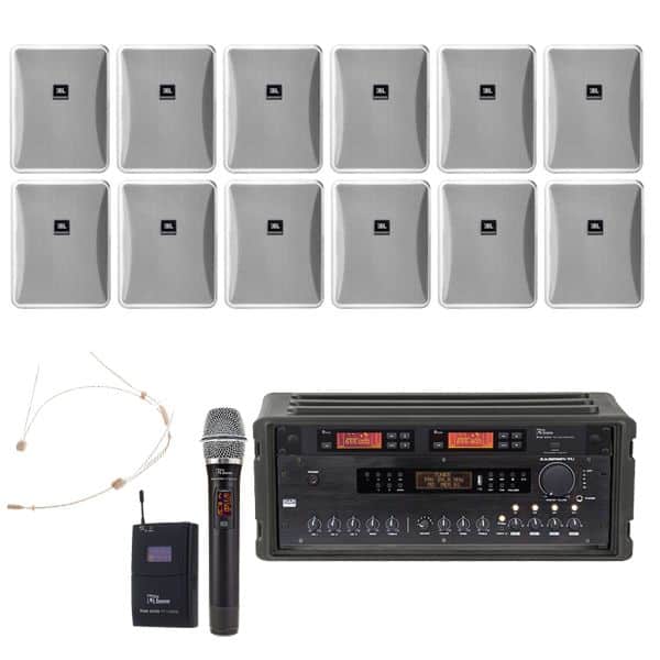 Sistem audio pentru sali de conferinte, evenimente, seminarii, sedinte, prezentari, format din 12 boxe JBL Control 25-1, mixer amplificat si set microfoane wireless de mana si headset. Acest sistem poate sonoriza o sala de pana la 400 mp cu o asiatenta de max 300 persoane.