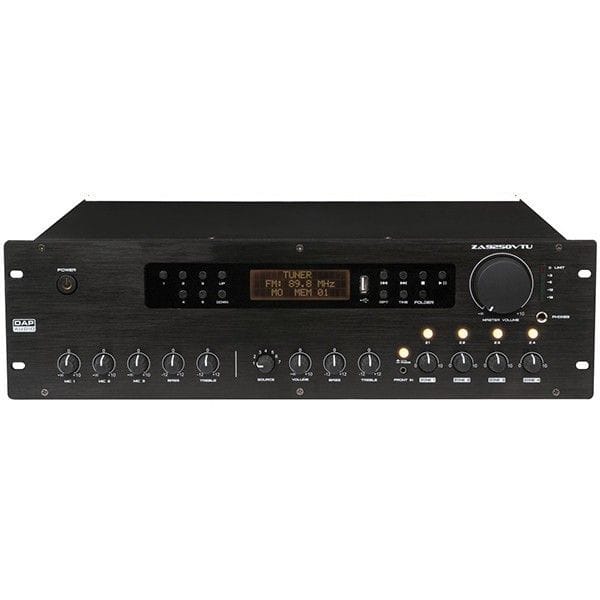 Mixerul amplificat DAP ZA9250VTU are 240W, 4 zone individuale ajustabile, 3 intrari microfon cu alimentari Phantom, tuner FM si player USB.