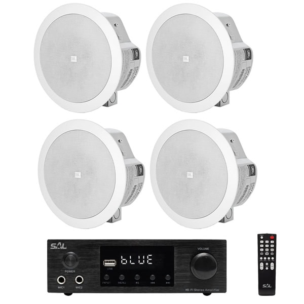 Pachet Sistem Audio cu 4 boxe JBL incastrabile in plafon culoare alba si amplificator cu bluetooth, tuner FM, USB si telecomanda.
