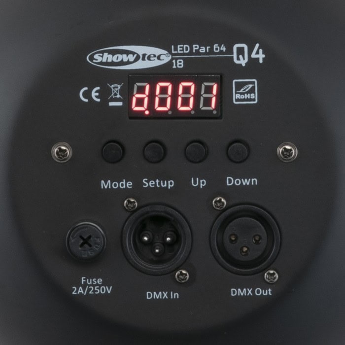 Proiector scena Showtec LED Par 64 Short Q4-18 RGBW de 18 x 8 wați cu unghi fix de 40°, potrivit pentru locații interioare. Designul său scurt și compact și suportul dublu permit o poziționare ușoară pe podea. Par 64 Short Q4-18 poate fi controlat manual, prin DMX și Master/Slave, fie în modul Manual, Auto Run și controlat prin sunet
