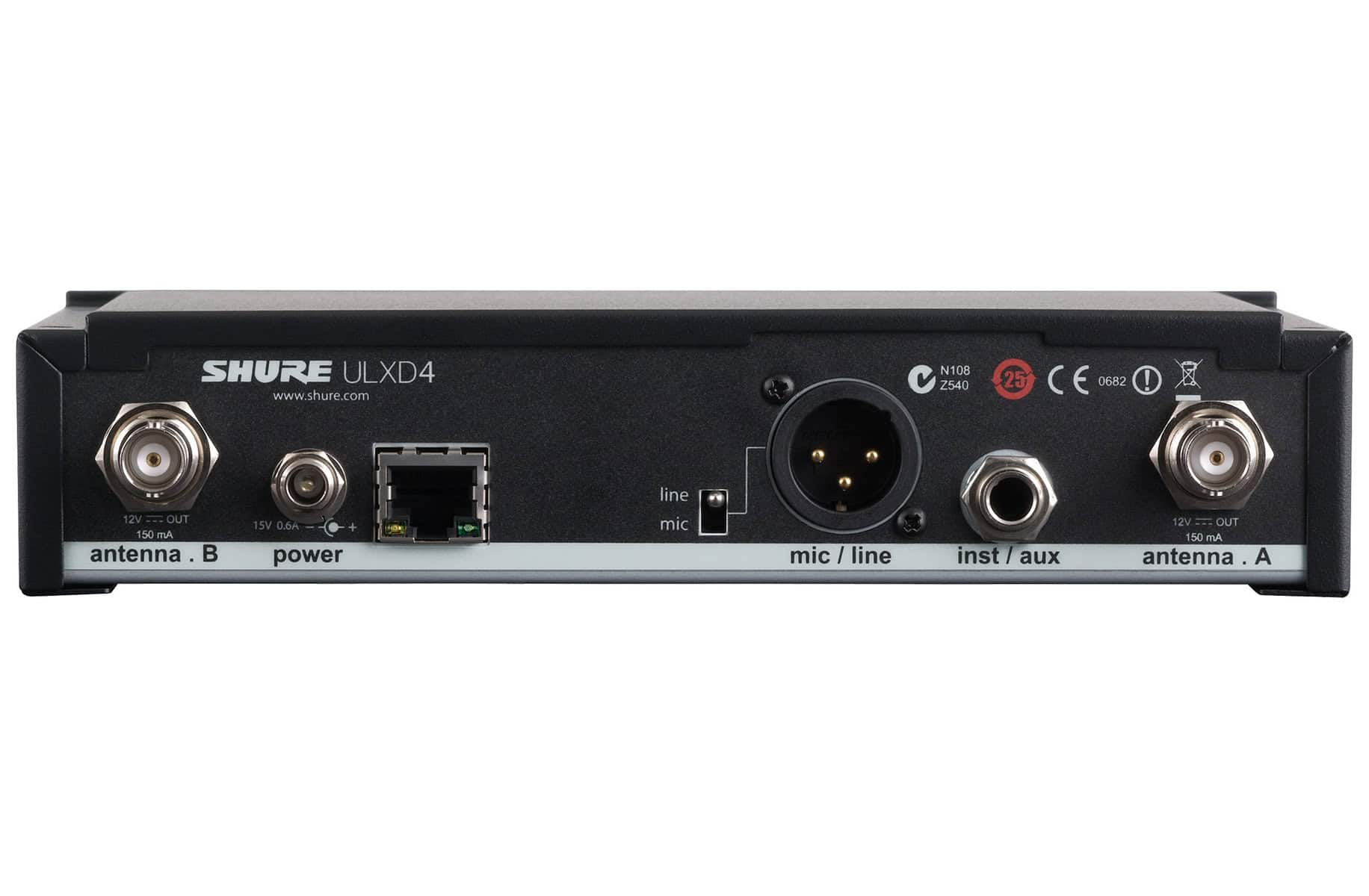 Shure ULXD4, receptor wireless profesional, sistem digital cu ecriptare AES256, lățime de bandă de 64 MHz și sistem de scanare predictiv a frecvențelor și gamă dinamică de peste 120 dB.