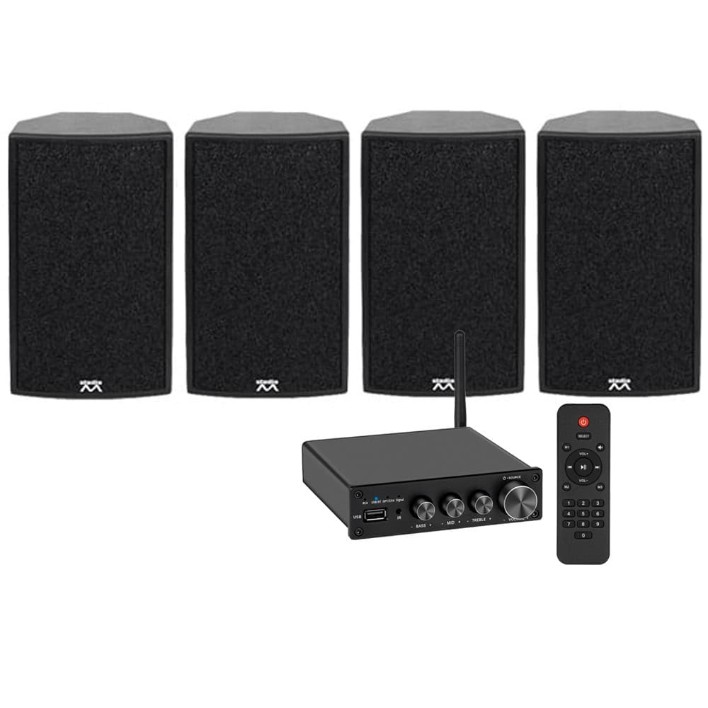 Sistem audio 4 boxe cu design deosebit si discret, conceput pentru sonorizare in restaurant, pub-uri cu dimensiuni mici (70-80mp), pentru muzica ambientala sau mici petreceri. Boxele au filet pentru aplicare pe perete sau pot fi amplasate pe raft. Amplificatorul de ultima tehnologie digitala are putere mare, reglaj EQ, bass si inalte si conectivitate bluetooth.