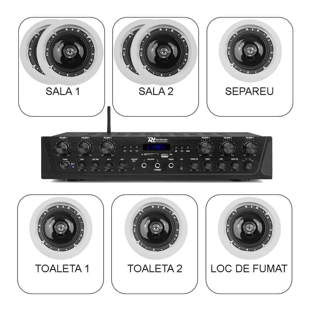Sistem audio in tavan pentru home hi fi, restaurant, cafenea, hotel, echipat cu 6 boxe incastrate in plafon ce pot fi impartite in 6 zone reglabile individual, bluetooth si tuner FM. Amplificatorul Power Dynamics contine player MP3, bluetooth si Radio FM cu telecomanda.