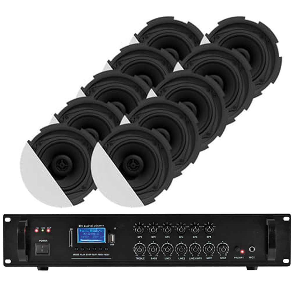 Sistem audio Audac ce contine boxele de tavan full range CIRA530 cu design grila fara margini. CIRA530 ofera un sunet clar si inteligibil, potrivit pentru sistemele de 100 V pentru anunturi si muzica de fundal. Amplificat de MPA240, acesta ofera o flexibilitate extraordinara pentru conectarea surselor si a microfoanelor. Acest sistem cu 6 boxe CIRA530 poate acoperi suprafete de 150 – 200 m2