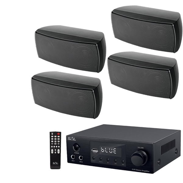 Sistem de sonorizare complet cu boxe sateliti pentru cafenea, restaurant, terasa sau pentru acasa. Sistemul contine 4 sateliti audio de culoare neagra, mini-aplificator cu bluetooth si set de cabluri. Desi foarte compact, sistemul ofera un sunet superb si natural, cu dispersie foarte uniforma.