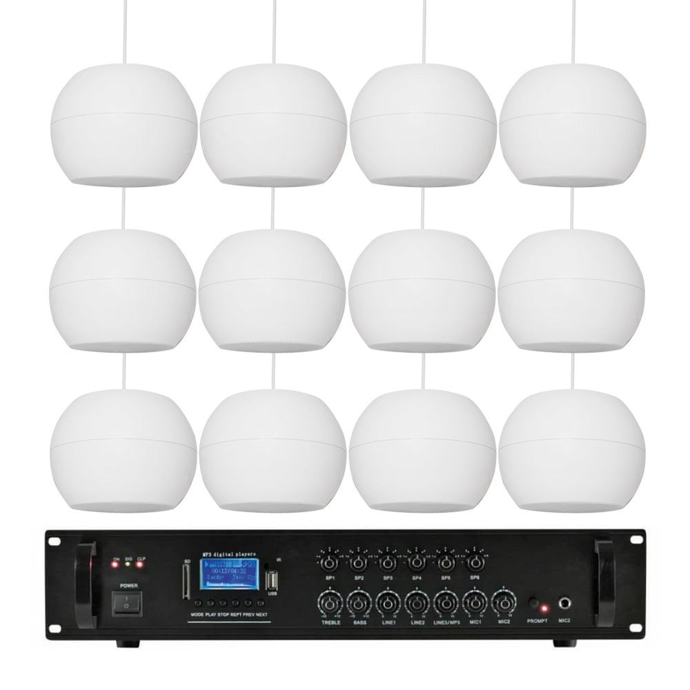 Sistem sonorizare in tavan pentru restaurant, cafenea, hotel, cu 12 boxe suspendate. Contine 12 pendante ce pot fi impartite in 6 zone reglabile individual. Amplificatorul contine player MP3, bluetooth si Radio FM. Boxele ofera un sunet excelent cu bass puternic, si au un design foarte elegant. Optional, puteti adauga microfoane sau surse audio externe.