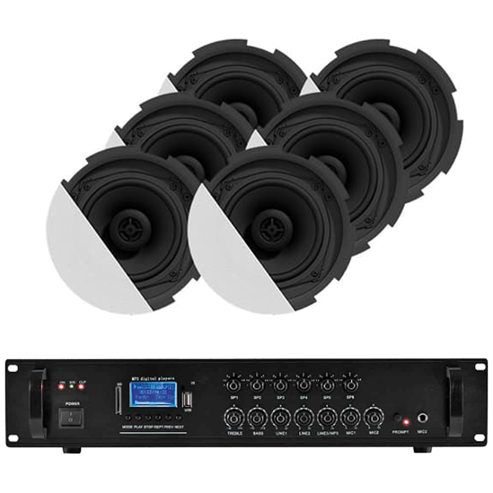 Sistem de sonorizare Audac ce contine boxele full range CIRA530 cu design grila fara margini. CIRA530 ofera un sunet clar si inteligibil, potrivit pentru sistemele de 100 V pentru anunturi si muzica de fundal. Amplificat de MPA240, acesta ofera o flexibilitate extraordinara pentru conectarea surselor si a microfoanelor. Acest sistem cu 6 boxe CIRA530 poate acoperi suprafete de 100 m2