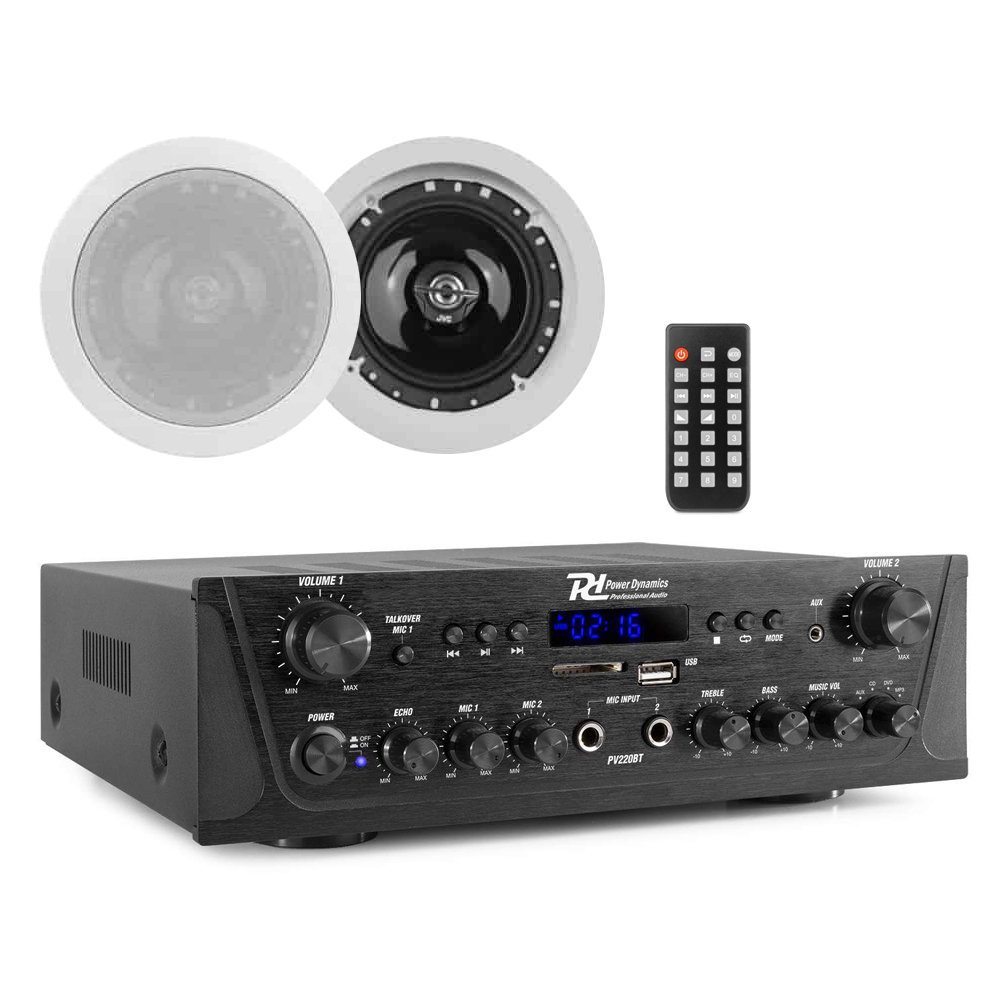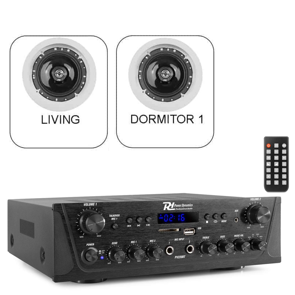 Sistem audio in tavan pentru home hi-fi, restaurant, cafenea, echipat cu 2 boxe incastrate in plafon ce pot fi impartite in 2 zone reglabile individual, bluetooth si tuner FM. Amplificatorul Power Dynamics contine player MP3, bluetooth si Radio FM cu telecomanda.