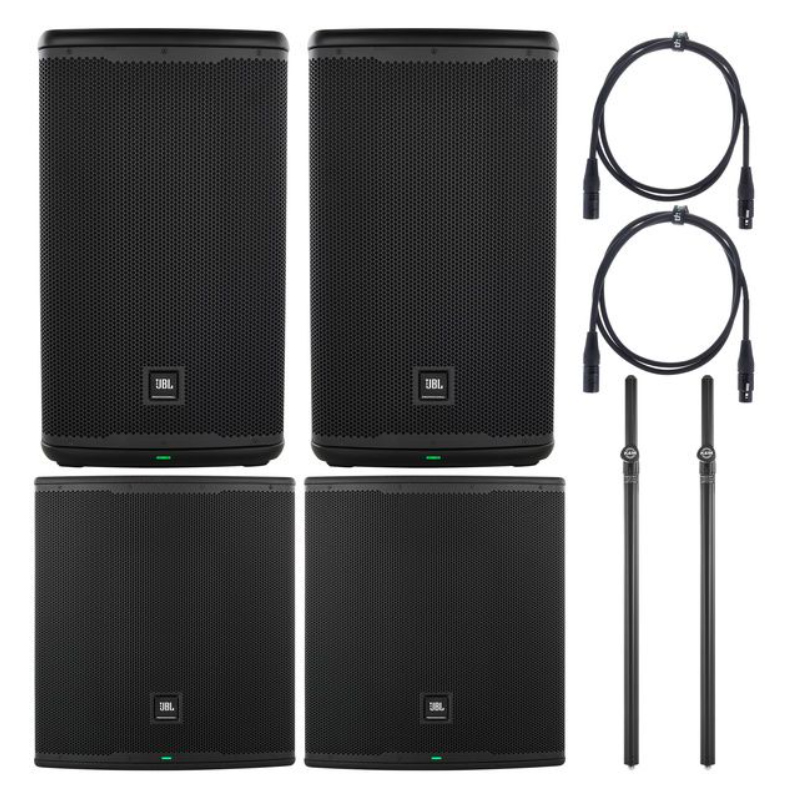 Sistem JBL activ EON 712 Power Bundle, de putere, format din doua subwoofere JBL EON 718S si doua boxe JBL EON 712, ideal pt DJ si formatii de live.