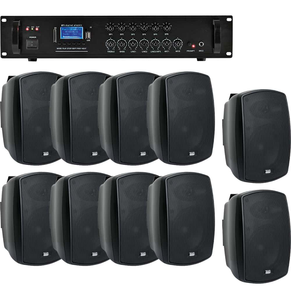 Pentru localuri interioare, exterioare sau spatii inchise cu terasa, etc. Sistemul contine 10 boxe protejate impotriva umiditatii, amplificator 240W cu bluetooth si control pentru 6 zone individuale. Boxele sunt echipate cu difuzoare 4.5 inch si tweeter, au un sunet profund si cristalin si sistem de aplicare pe perete inclus.
