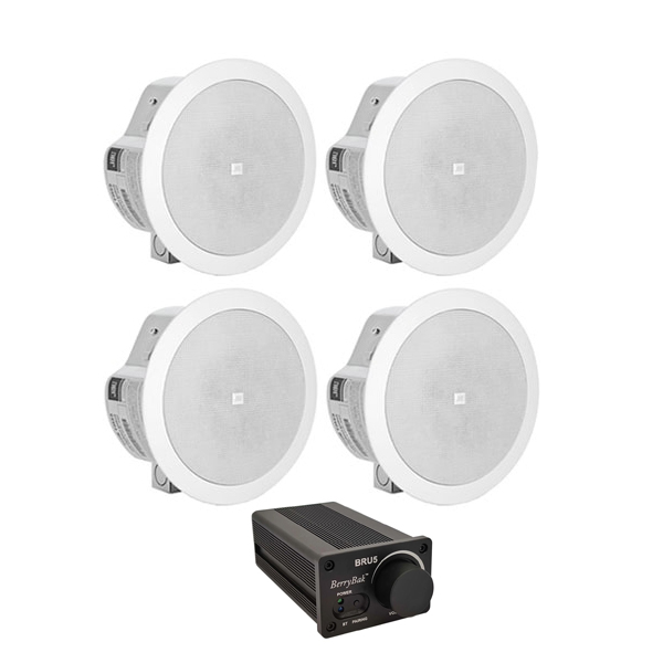 Sistem Audio cu 4 boxe JBL incastrabile in plafon culoare alba si amplificator BRU5, pentru restaurant, bar, pub, etc. Fata de alte sistme incastrabile, aceasta varianta va oferi atat un sunet curat si echilibrat, cat si o putere considerabila, in cazul unor mici petreceri.